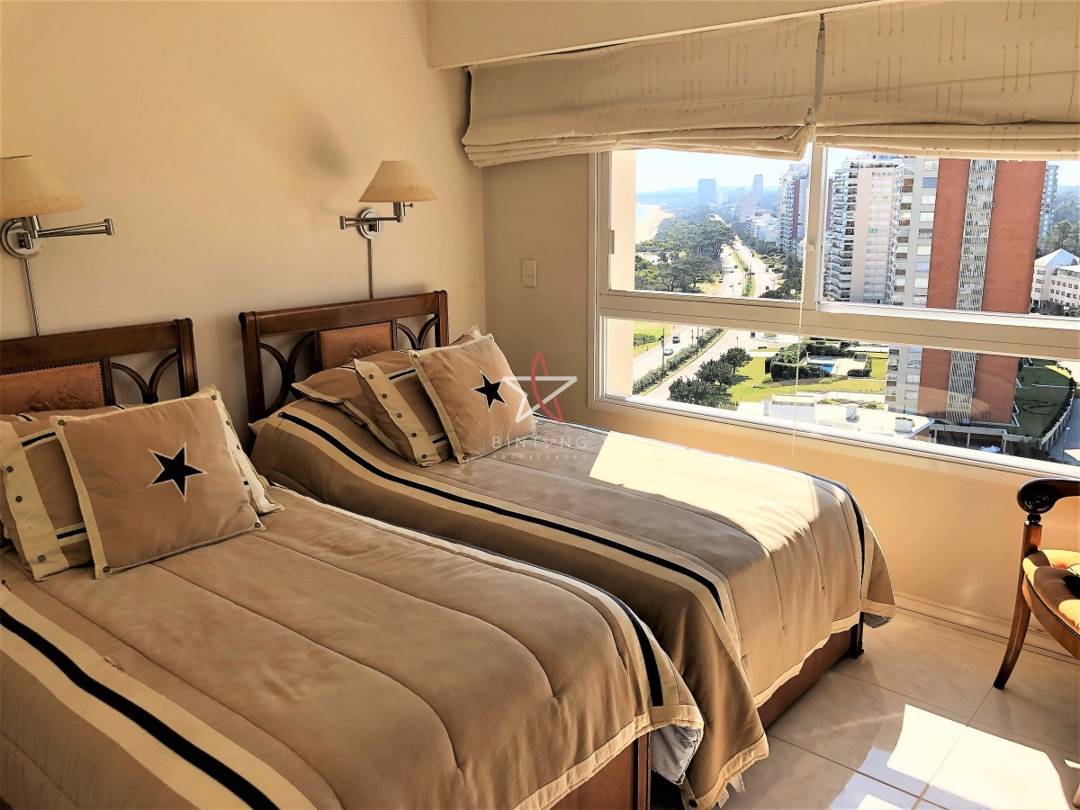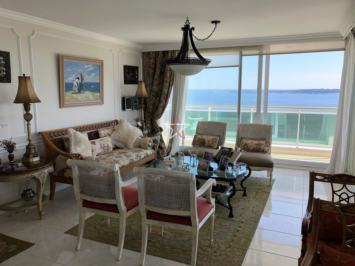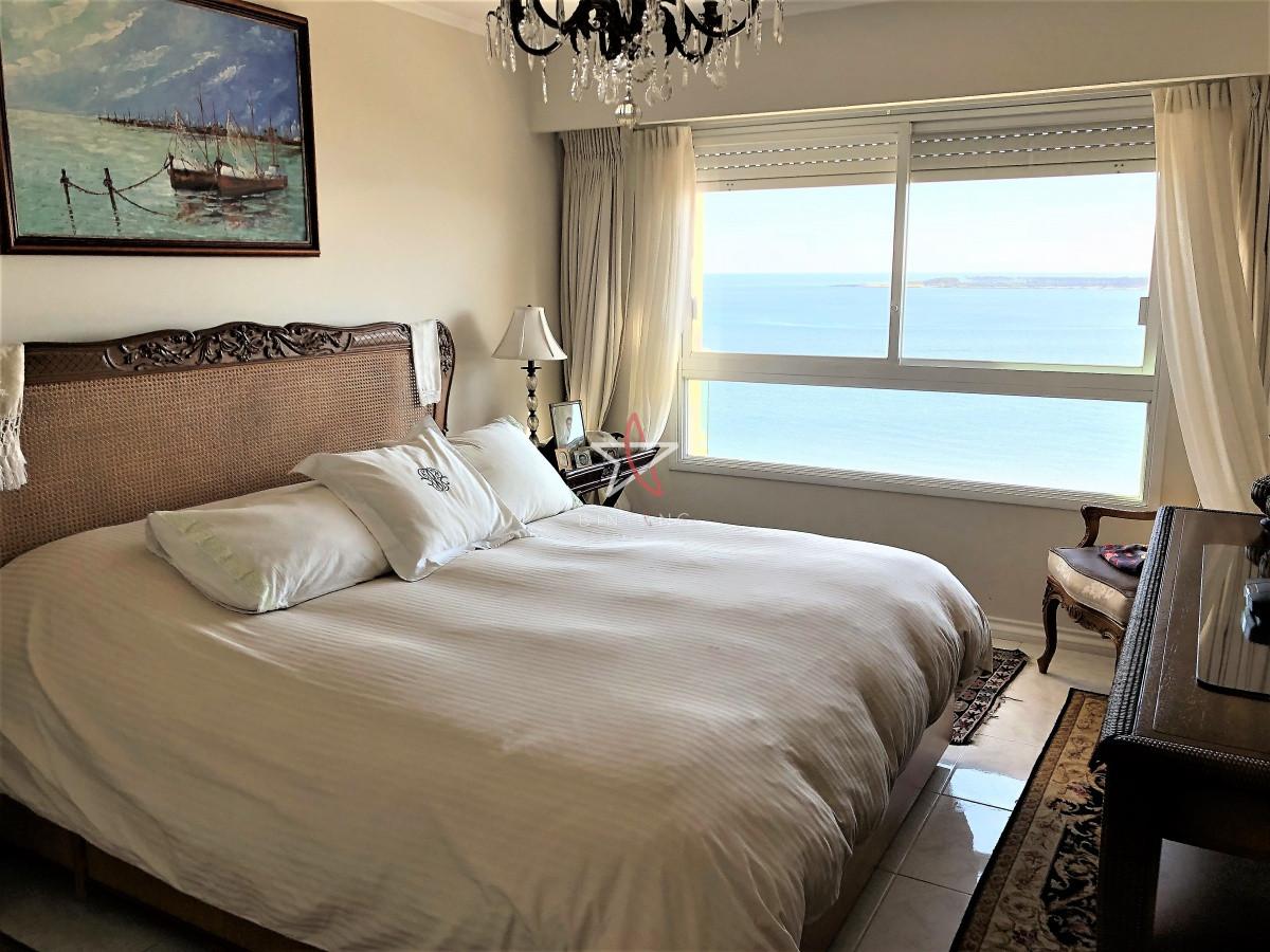 Piso alto con cómodo living comedor, terraza al frente. 3 dormitorios en suite, principal con vista franca al mar, los otros dormitorios con vista lateral al mar. Toilette. Cocina completa, dependencia de servicio. Garage para un auto. BINTANG Propiedades.