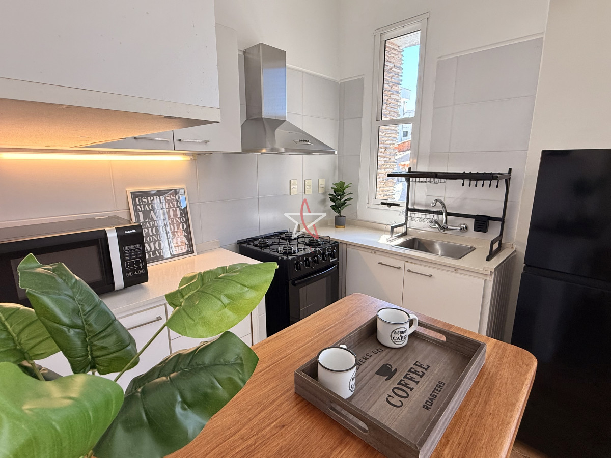 Todos los ambientes son luminosos, con techos de 3 metros, cocina integrada y detalles clásicos. La unidad cuenta con aire acondicionado, cortinas de enrollar en todos los ambientes y se entrega totalmente equipada a estrenar, lista para entrar!