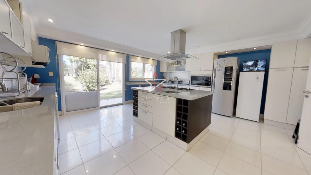 La cocina muy amplia y luminosa con isla y grandes ventanales.