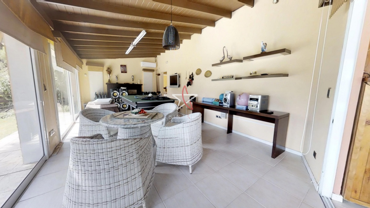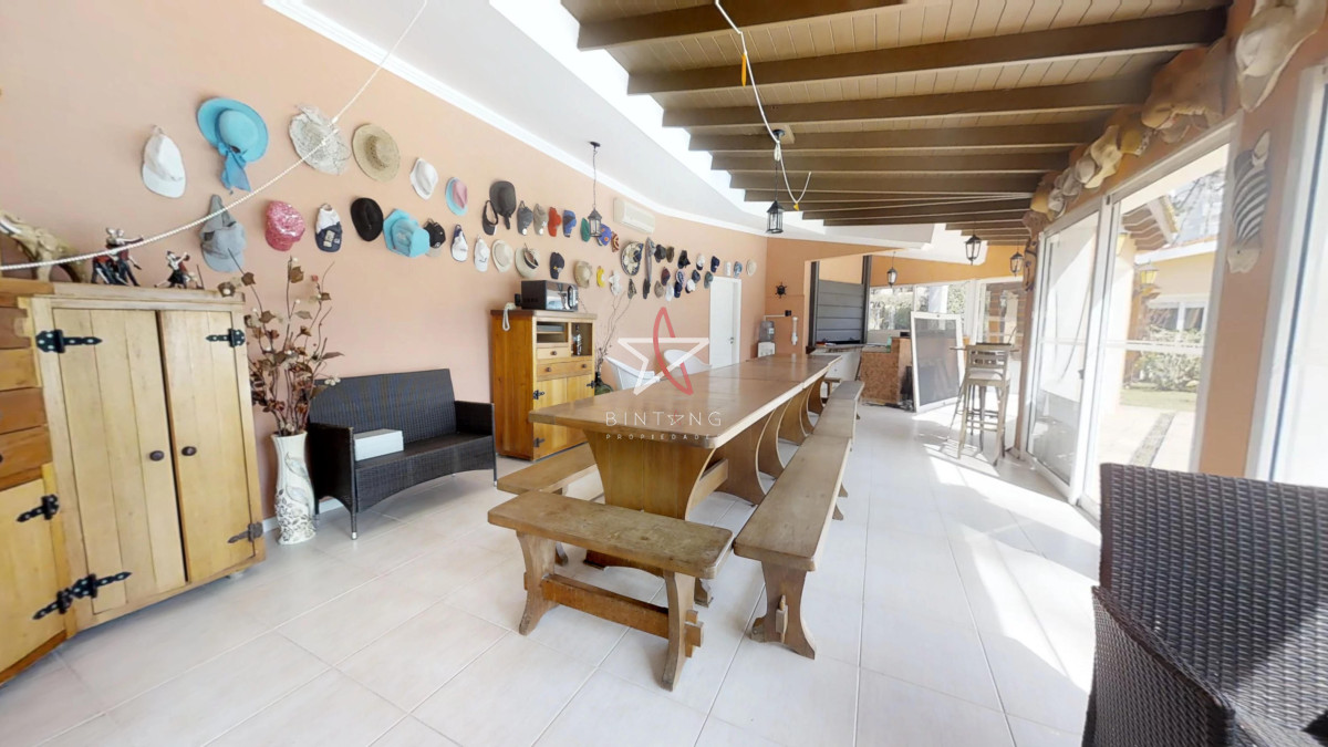 Gran barbacoa con área de estar y comedor mas playroom y baño.