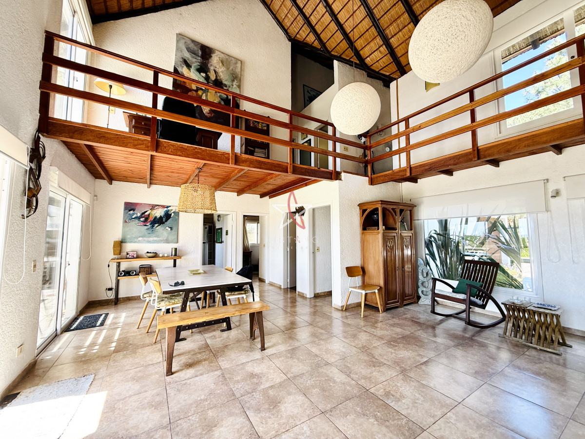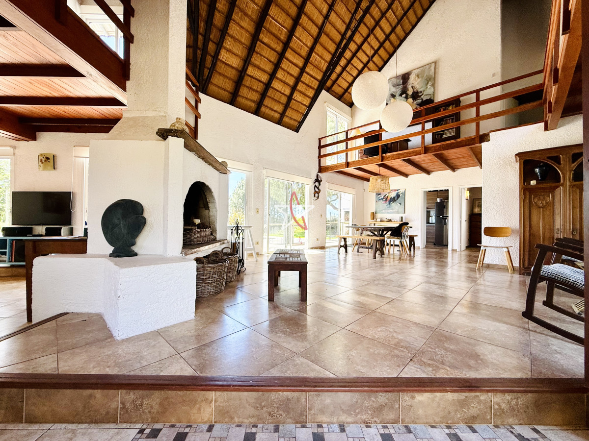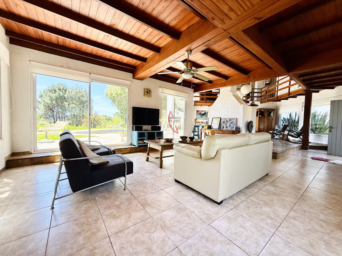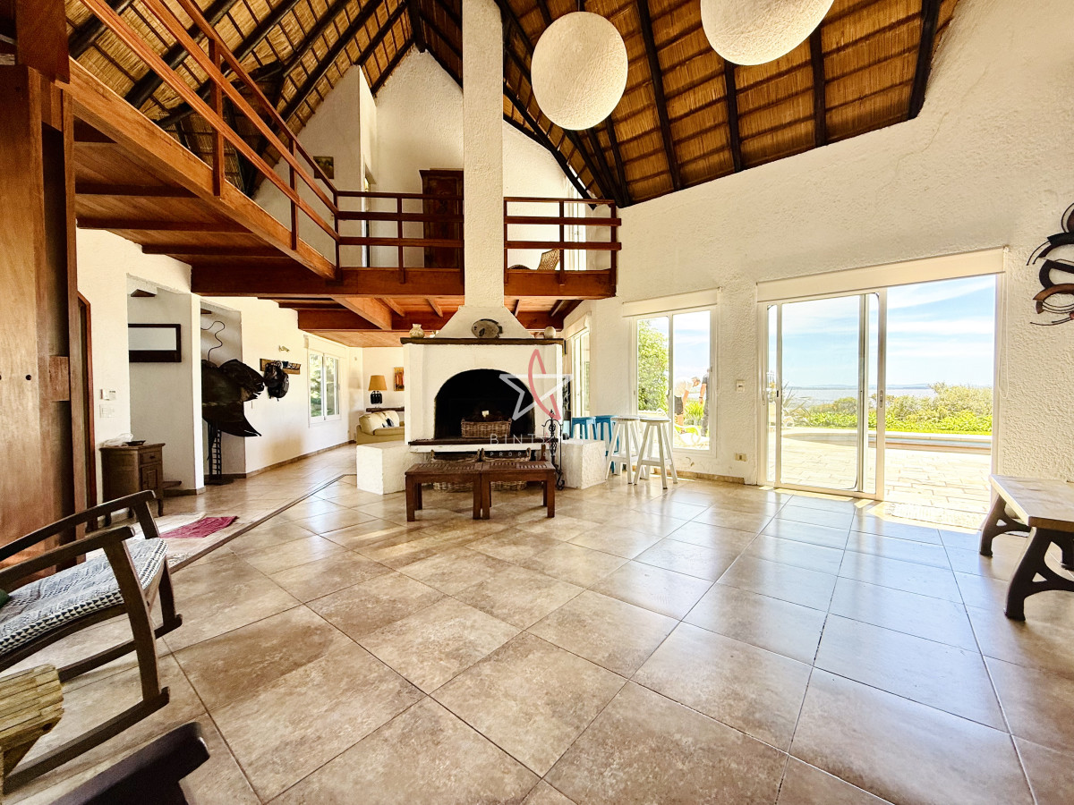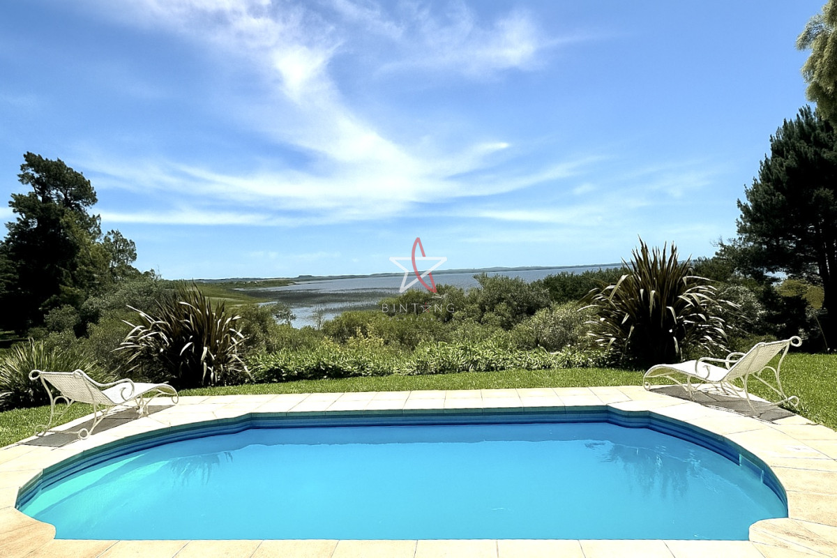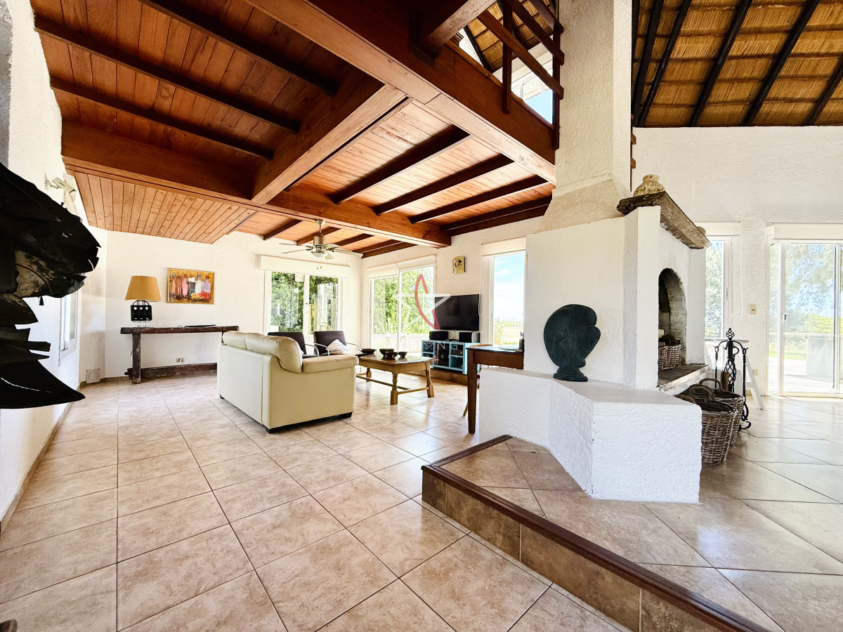 En planta baja encontramos un amplio living con estufa a leña, comedor, ambos con ventanales hacia la piscina y hermosa vista hacia la laguna.