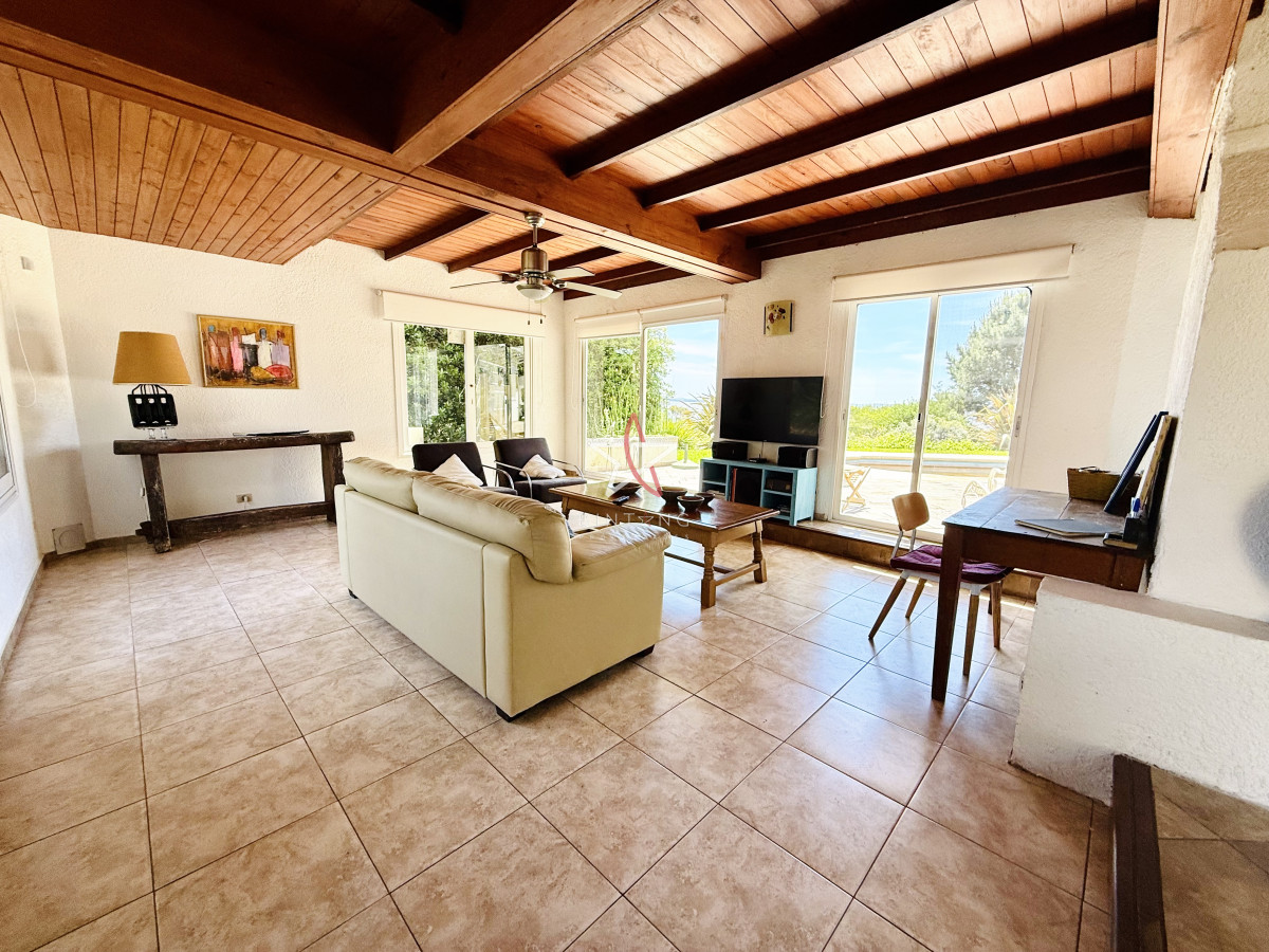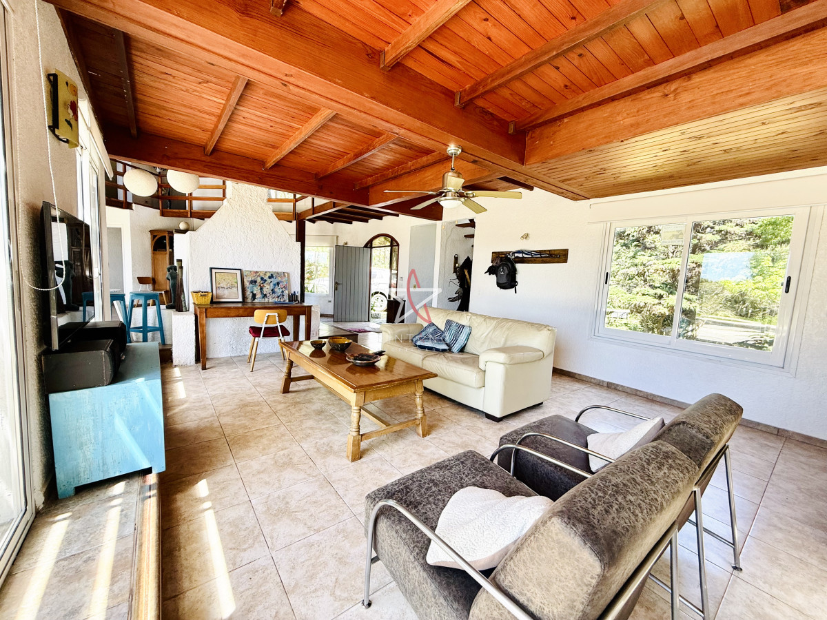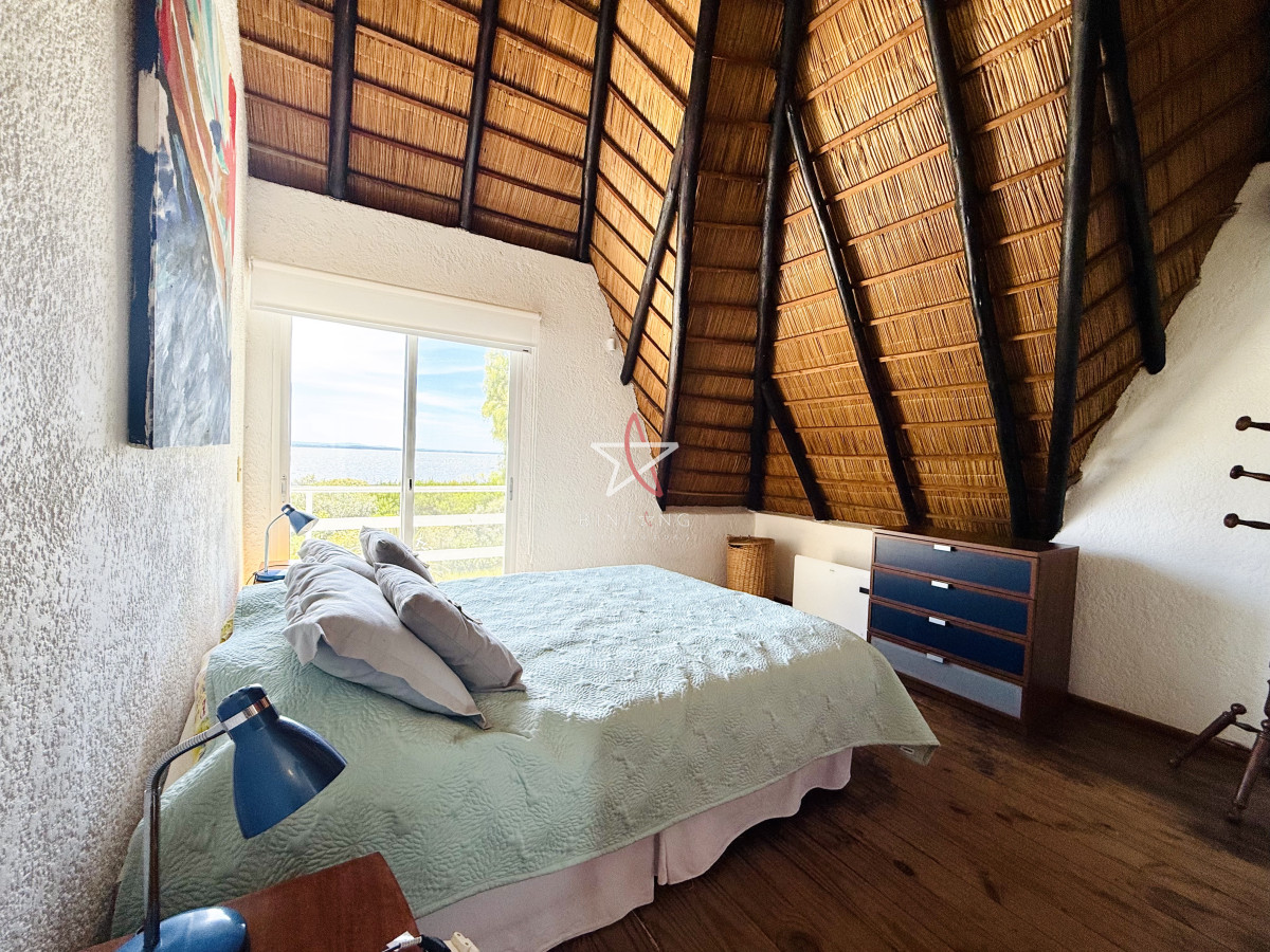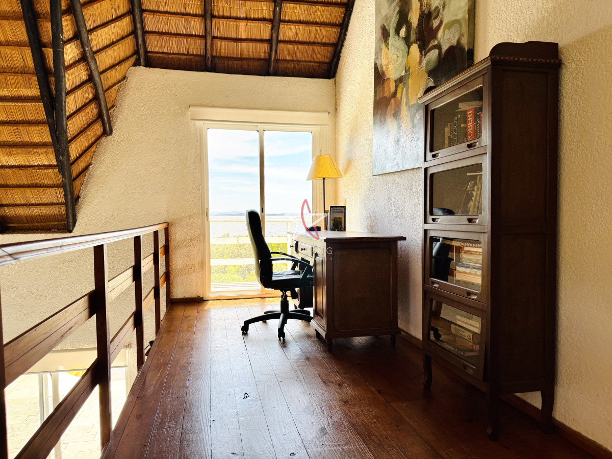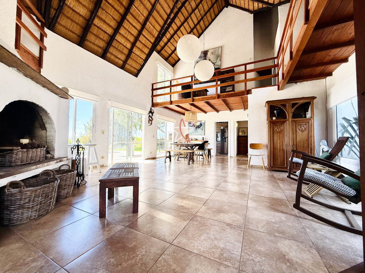 En planta baja encontramos un amplio living con estufa a leña, comedor, ambos con ventanales hacia la piscina y hermosa vista hacia la laguna.